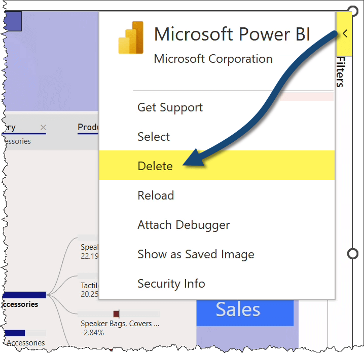 To remove the report from the slide, click the arrow button in the upper-right corner and select Delete.