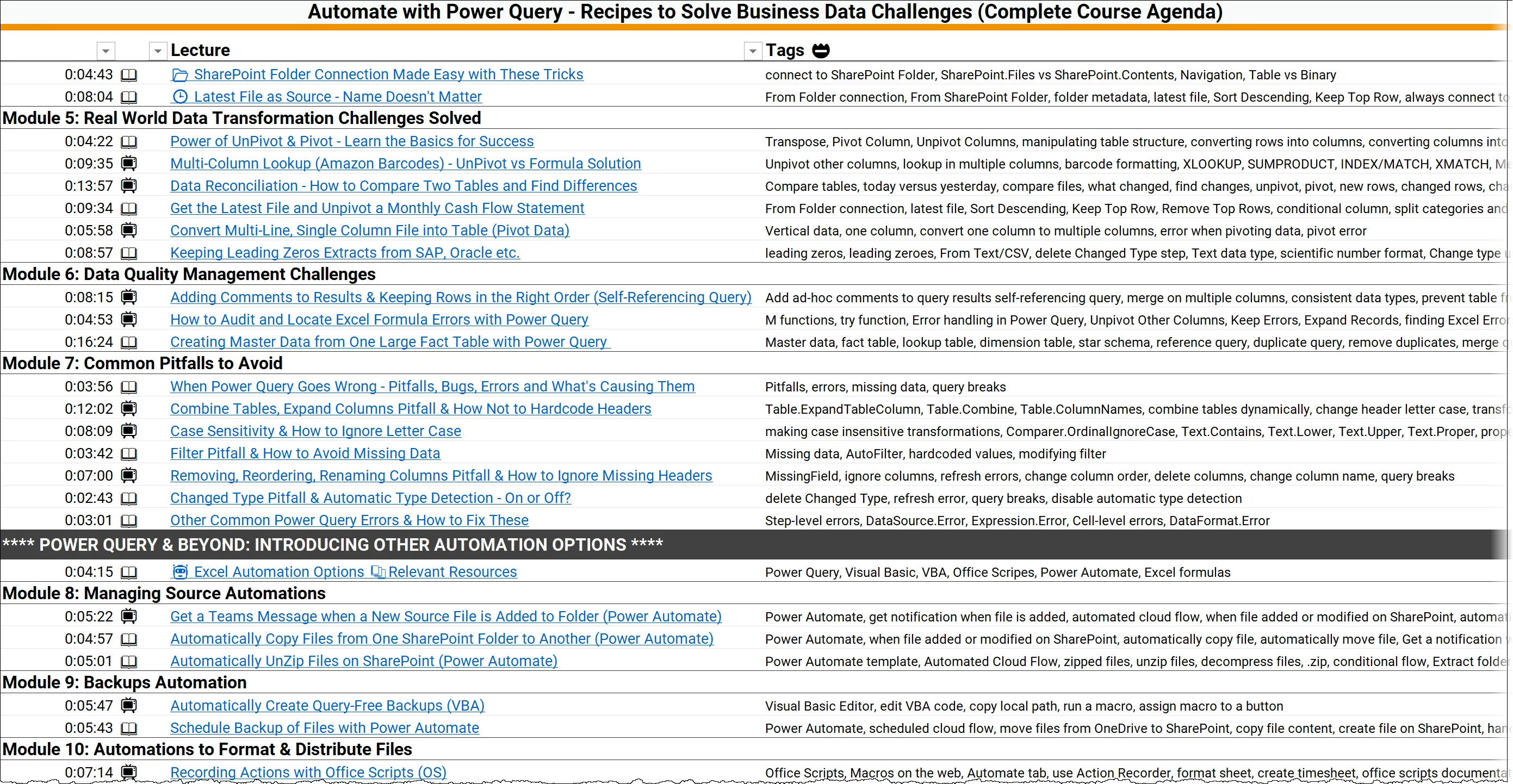 The course covers all the important aspects of Power Query and tackles real work-related problems. It is very precise.