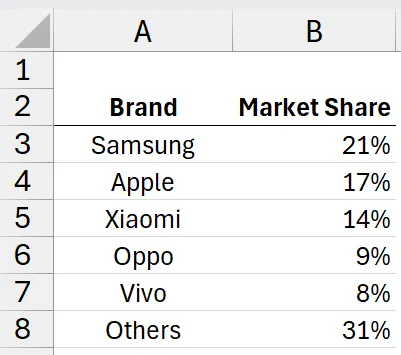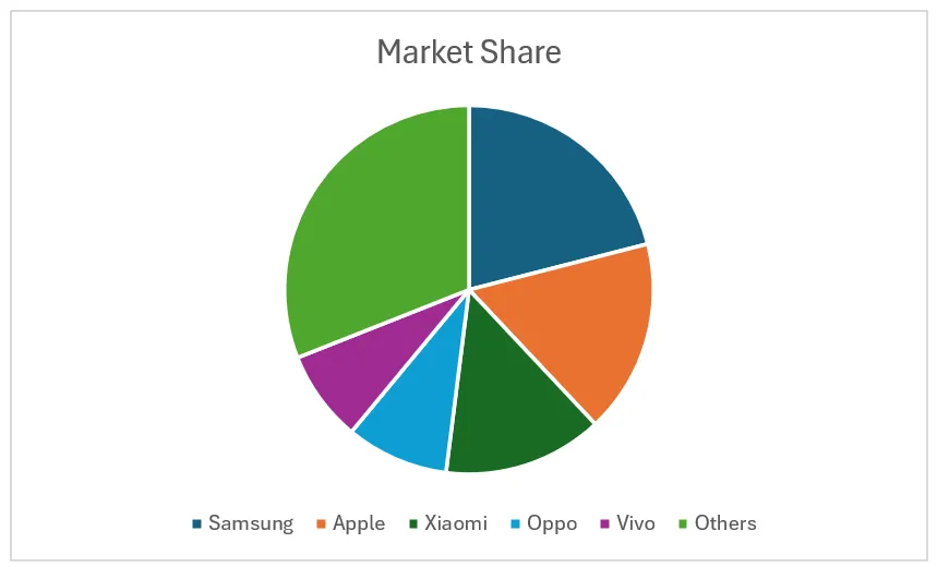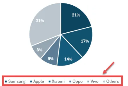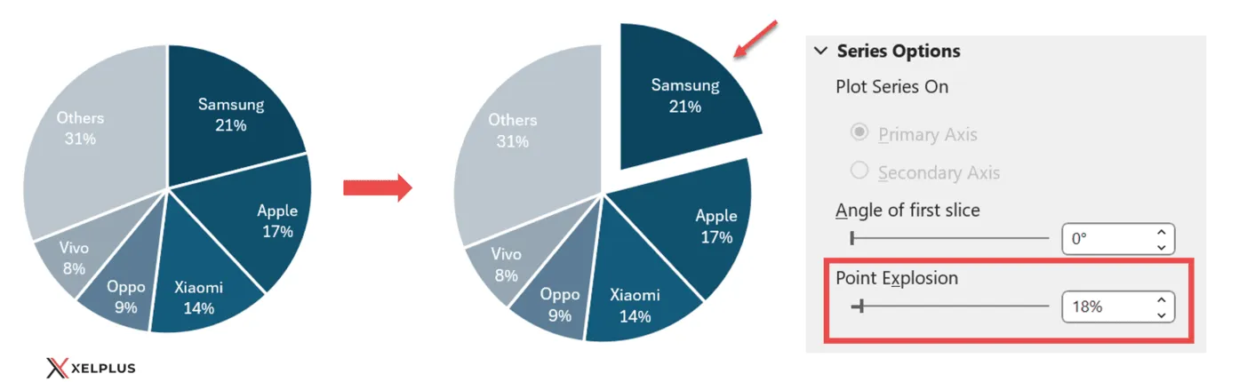 Rotating slices can help you position the most important data prominently. For example, you might want “Samsung” (21%) to appear at the top to emphasize its market share compared to other brands.