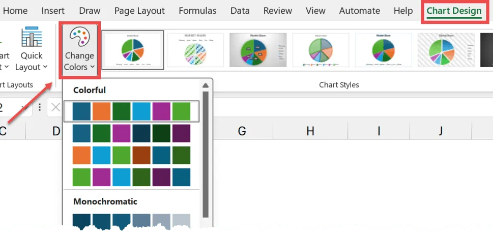 - Choose your preferred pie chart type. For this example, we’re using a 2-D pie chart.