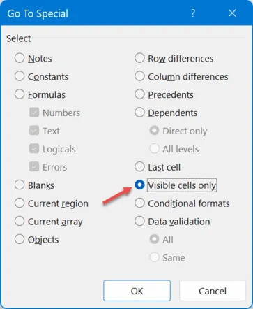 - In the Go To Special window, select “Visible cells only” and click OK.