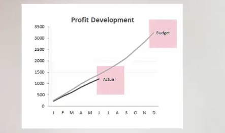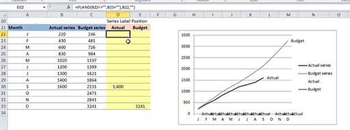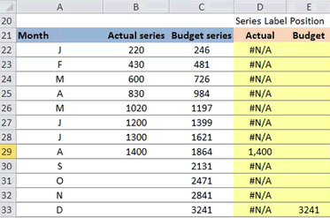 Getting the Budget Label is easy. The position of our budget label is going be our December month. The value we have for December is where we want the label to be. We can add a correction factor to this cell if we find that the positioning is not perfect.