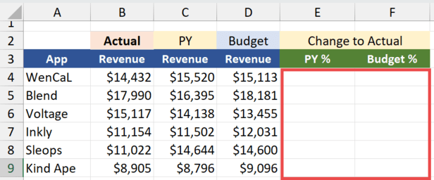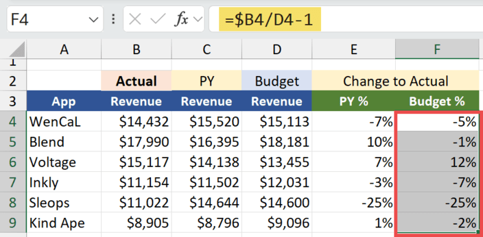 - You want to copy this formula down (for the other apps) and across columns (to compare to the budget).