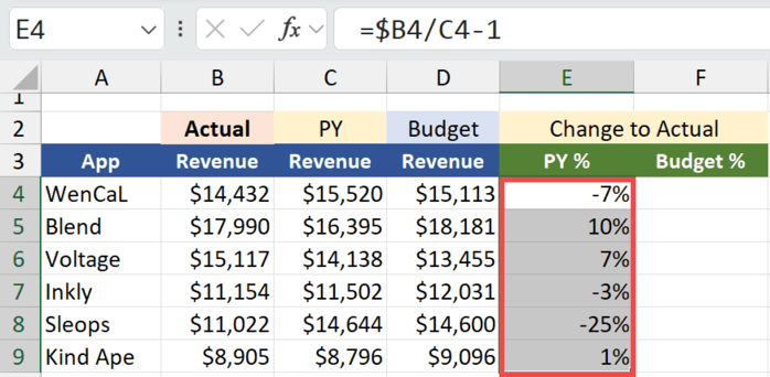 =B4/C4-1 - For a detailed guide about how to calculate percentage change in Excel check out this article.