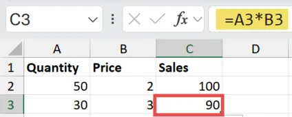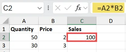For example, let’s say you have a formula in cell C2 that multiplies A2 by B2, like =A2*B2.
