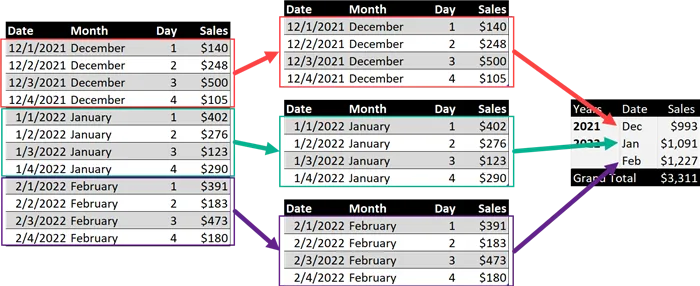 If we have a table of daily sales and we create a Pivot Table report showing total sales by month, the Pivot Table will take each month in the report and apply it as a filter to the entire dataset.