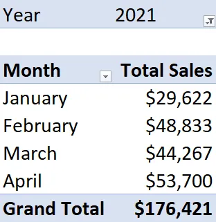 We start with a Pivot Table that shows “Total Sales” for the “Year” 2021 by “Month”.