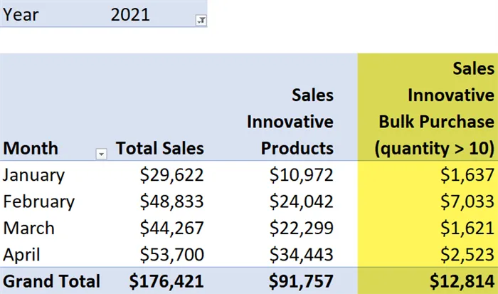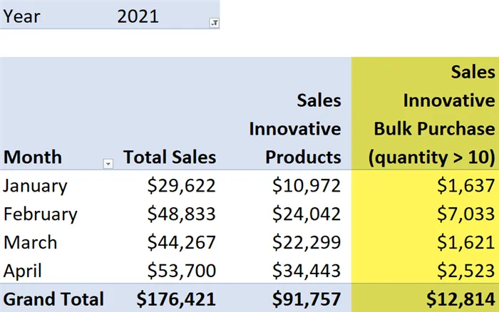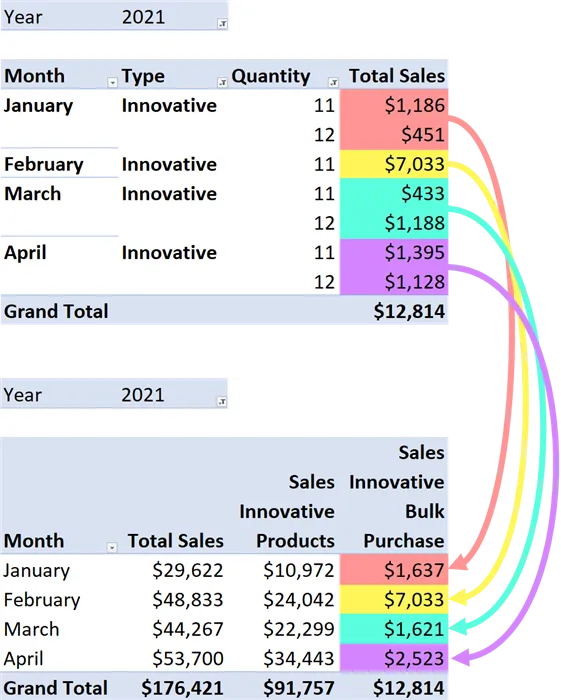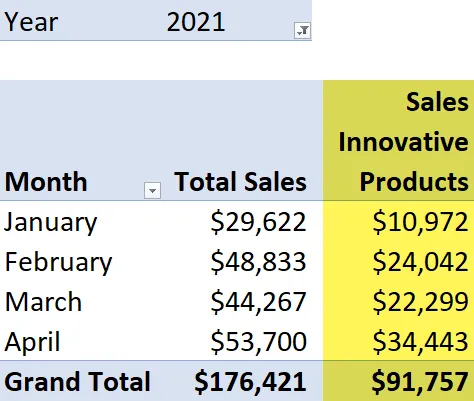 We could write a DAX Measure that uses CALCULATE to reduce the existing “Total Sales by month for 2021” by filtering each row in the Pivot Table to only rows in the data where the product type is classified as “Innovative”.