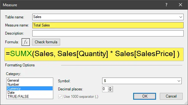 =SUMX(Sales, Sales[Quantity] * Sales[SalesPrice] )
