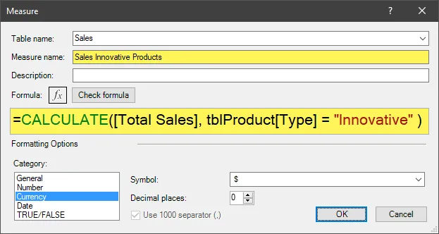 In our Data Model, we create a Measure called [Sales Innovative Products] that contains the following formula.