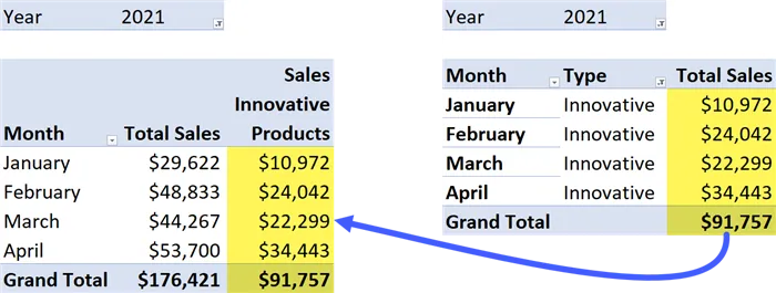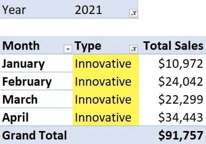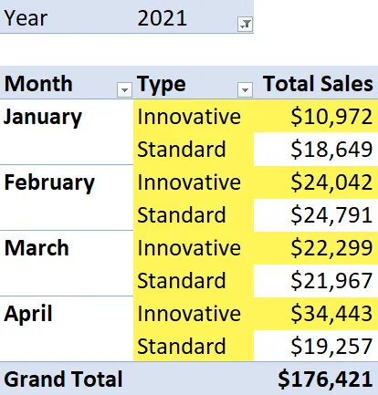 In the above Pivot Table, we have added the [Type] field to the Rows section to break down each month by either “Innovative” or “Standard”.
