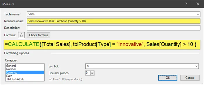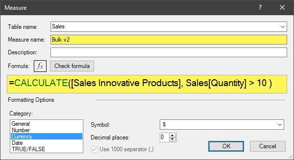 In our Data Model, we create a Measure called [Sales Innovative Bulk Purchase (quantity > 10)] that contains the following formula.