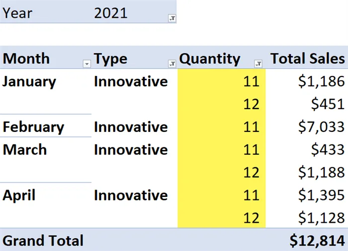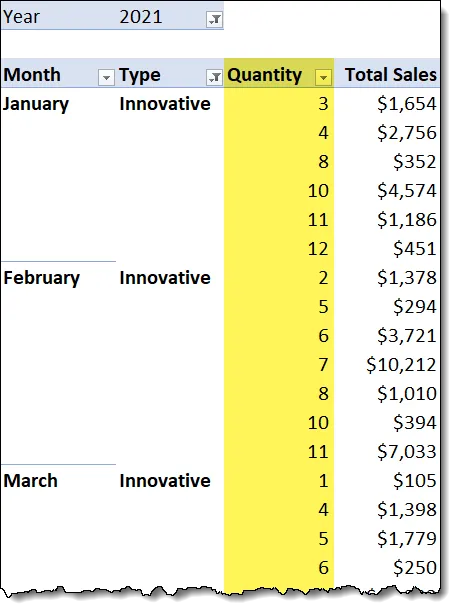 In the above Pivot Table, we have added the [Quantity] field to the Rows section to break down each month/type by their respective quantities.
