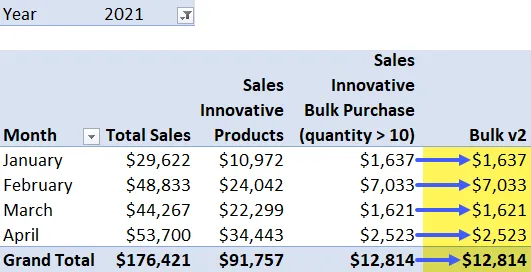 The Measures respect the original Pivot Table filters (year and month), then apply additional filters.