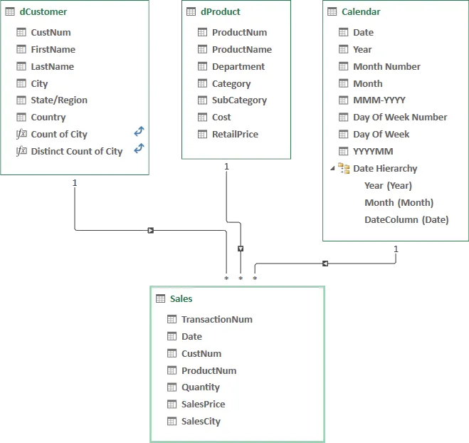 As we can’t just create a relationship between the “dCustomer” table and the “Calendar” table (there are no common fields between them), we will write a DAX formula that will traverse the three tables using the “Sales” table to coordinate the conversation. Let’s call this formula “Distinct Count of Sales City”.
