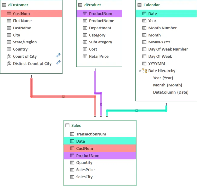 - [CustNum] connects “dCustomer” and “Sales”