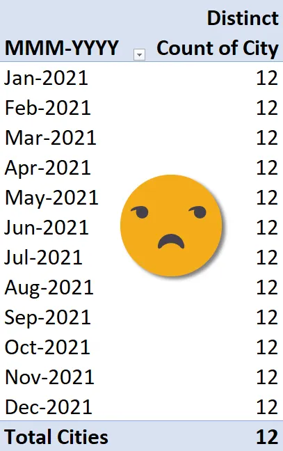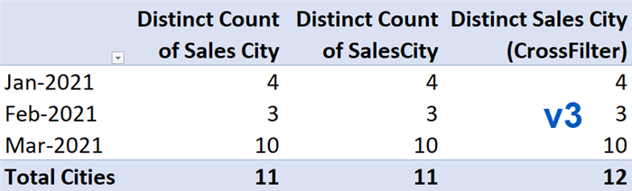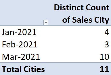 Just as the entry “Jan-2021” is used to filter the Data Model (this example results in 3 different cities), the “Total Cities” will filter the Data Model to show a unique list of ALL cities (that being 11).