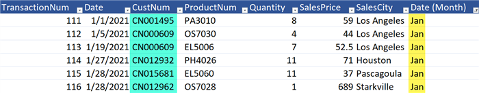 Continuing with the “Jan-2021” example, if we filtered the “Sales” table to only display transactions from “Jan-2021”, we would be presented a list of customer numbers ([CustNum]) for that month.