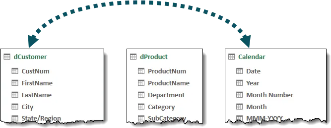 We need to include the “Sales” table in this conversation to help us filter the “dCustomer” table based on the [CustNum] field.