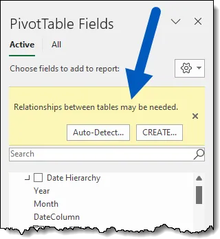 The Pivot Table even lets us know that a relationship may be missing to satisfy this report.