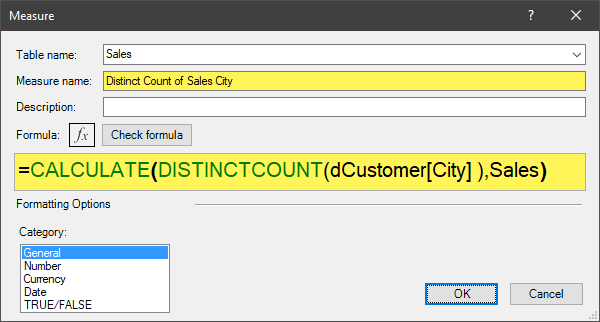 The expression that CALCULATE will use is the DISTINCTCOUNT function. We will get a distinct count of the [City] field.