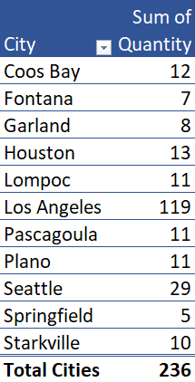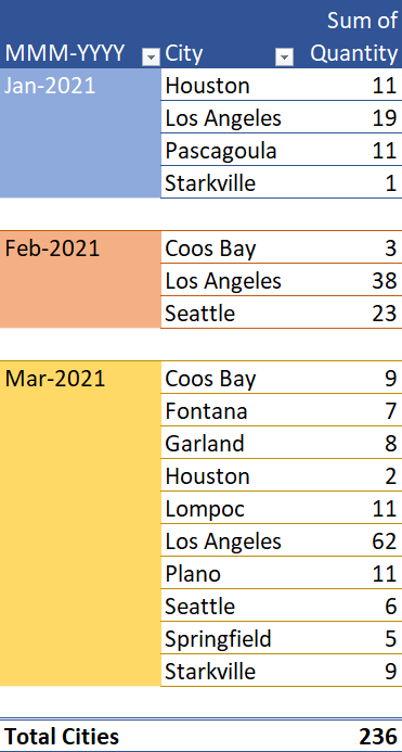 To help us understand more clearly how we arrived at these numbers, below is a Pivot Table report that shows the month-year and city names aggregating the quantity by each.
