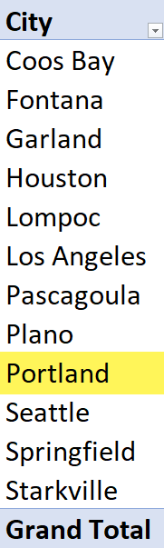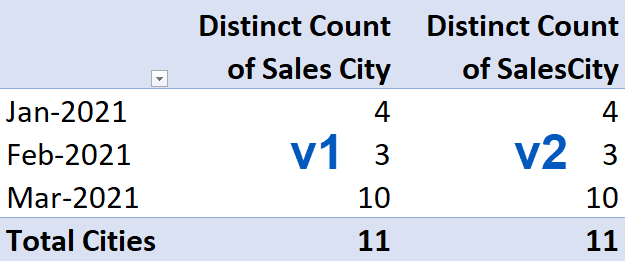 With this new [SalesCity] information in our “Sales” table, we can easily derive a distinct count of this new column in a Pivot Table.