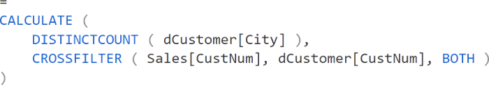 =CALCULATE(DISTINCTCOUNT(dCustomer[City] ), Sales)The CALCULATE function can alter our filter context.