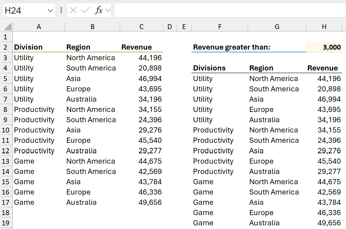 We want to show all records where the revenue (column C) is greater than a value defined in cell H2 (e.g., 45,000).