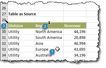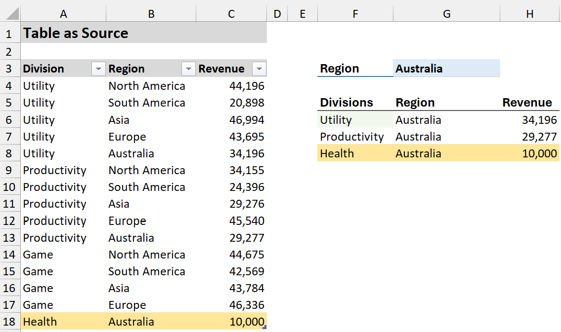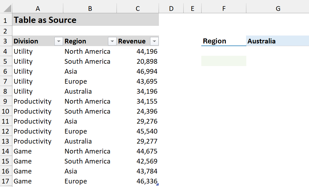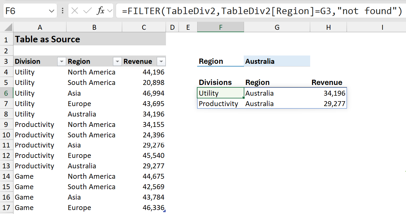 Let’s filter a Data Table (table name is TableDiv2) to show only rows where the “Region” matches the value in G3 (e.g., “Australia”).