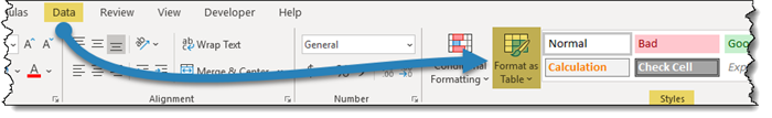 - In the Styles group, click Format as Table or press Ctrl + T.