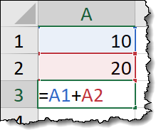 =A1 + A2if A1 contains 10 and A2 contains 20.