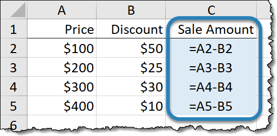 For example, let’s say you write a formula in cell C2 to deduct B2 from A2 (i.e., =A2 - B2).