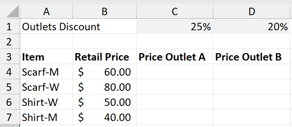 You want to calculate the final outlet prices for the items listed in cells A4 to A7 using these discounts.
