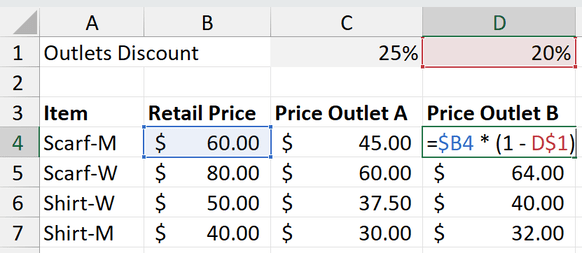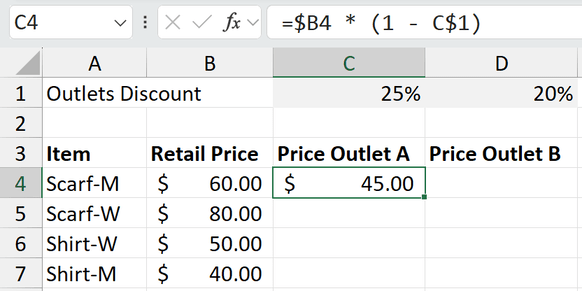- Copy Across: Now highlight C4 to C7 and drag the formula to column D. The reference to C$1 automatically updates to D$1, applying the discount for Outlet B, while the retail price still points to column B.