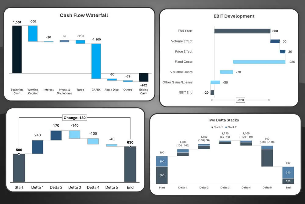 Waterfall charts display changes step by step. They suit a variety of reports like financial summaries and project updates.