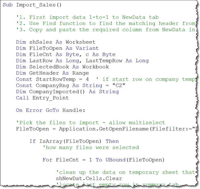 Unlike the simple VBA macro example, this solution can’t be created using the Macro Recorder. The branching logic, process looping, and user prompts are too complex and require hand-crafted code to operate properly.
