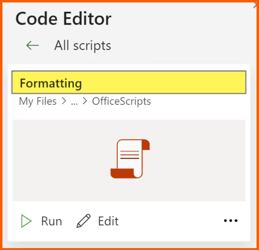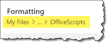 Scripts are saved in a file that is separate from the Excel file from which it was created. The scripts are saved in a file named “OfficeScripts” in a folder on your OneDrive site.