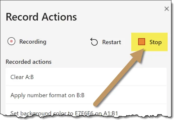 Stop the recording of the steps by clicking the Stop button in the Record Actions panel.