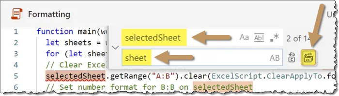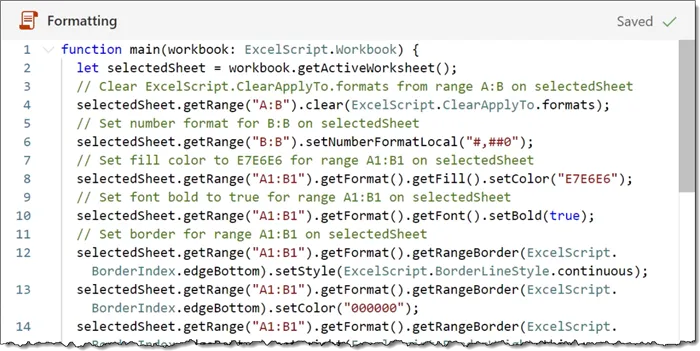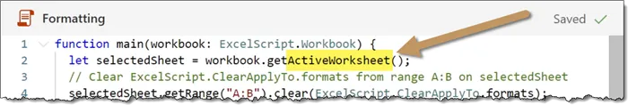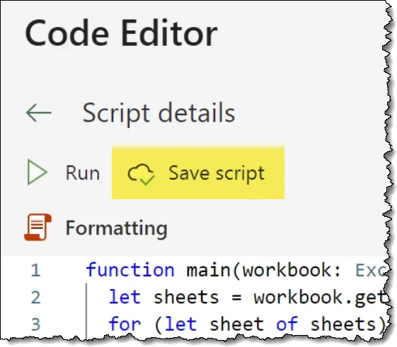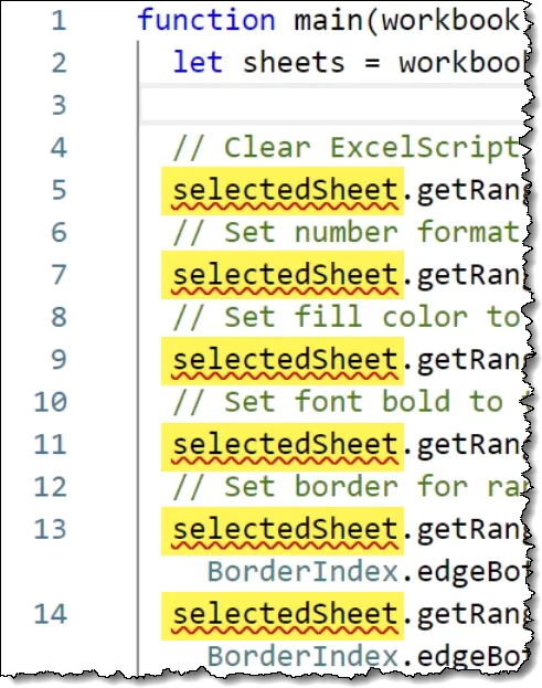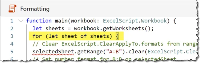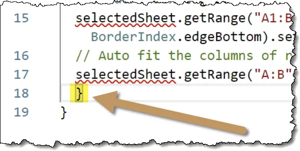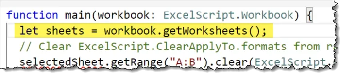 let sheets = workbook.getWorksheets();Return to the recorded script code and replace the existing LET statement with the copied code from above.