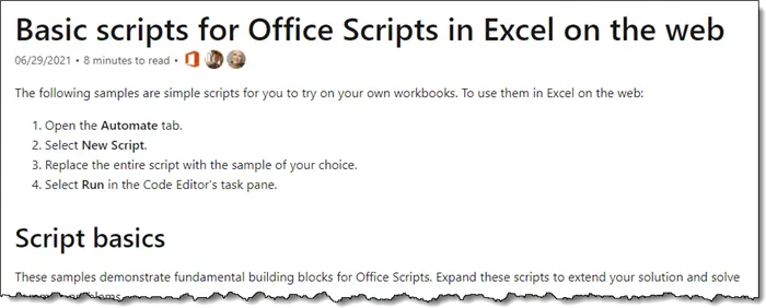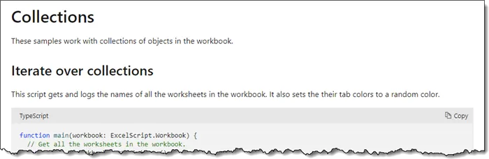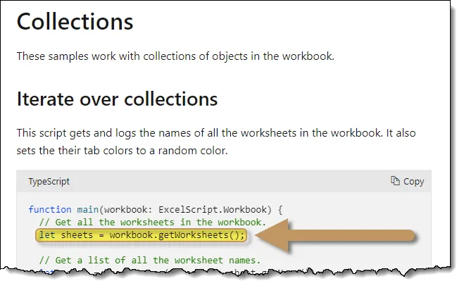 To figure out how to work with the sheets as a collection, we need to visit the Microsoft documentation website for Office Scripts.
