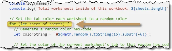 Copy the above code (for (let sheet of sheets) {) into memory and return to the recorded code.