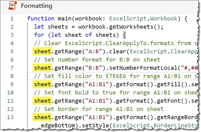 Here’s the scenario we’re dealing with: I want to create a script that applies special formatting to ALL my Excel sheets.