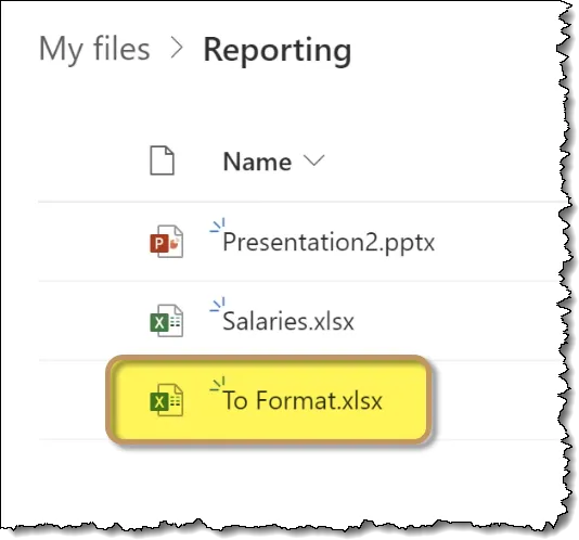 We’ve set up a folder named “Reporting” on our OneDrive where we have stored the file “To Format.xlsx” that holds the previously recorded formatting code.