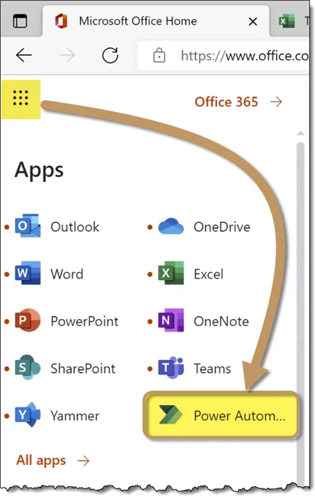 Return to the office.com main page and open Power Automate.