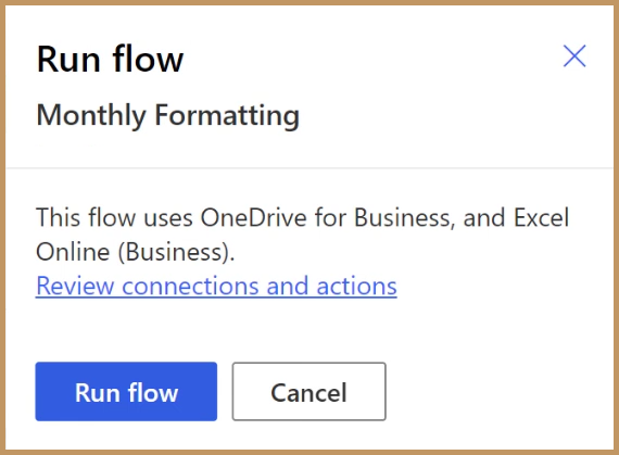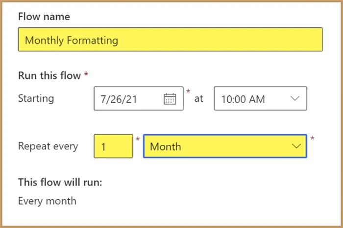 We name the flow “Monthly Formatting” and set the scheduling option for execution each month. Click Create when finished.