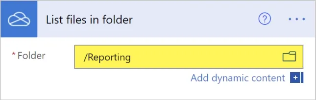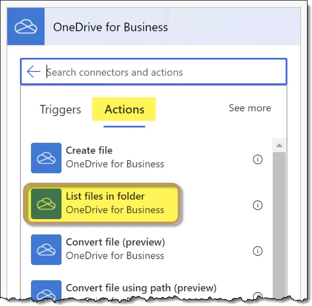 In the list of “OneDrive for Business” operations, we’ll select the action labeled “List files in folder”.