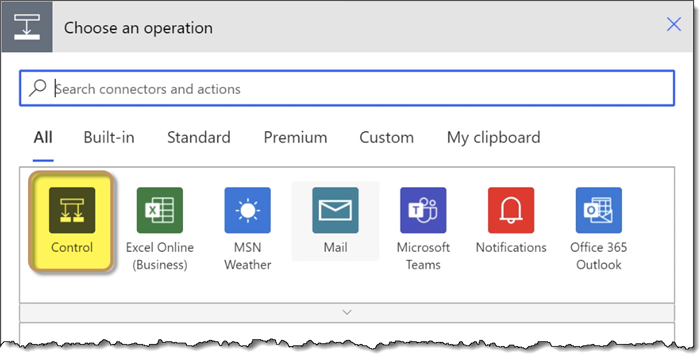Select Add Action at the bottom of the script and select Control from the Choose an Operation panel.