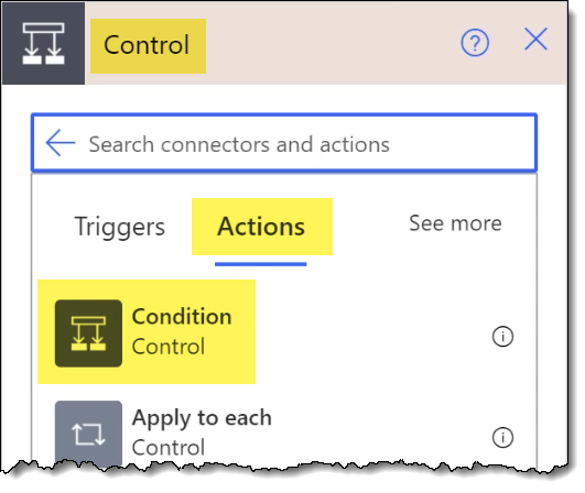 In the Control panel, select the Action labeled Condition.