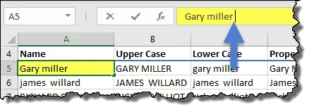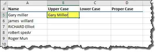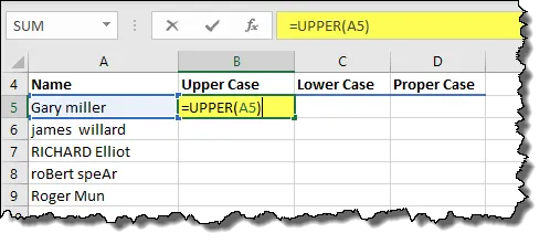 In our sample file, we will select cell B5 and enter the following formula to capitalize text:
